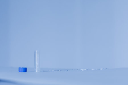 Closeup image of a transparent plastic test tube with a blue cap, held by fingers, against a gray background