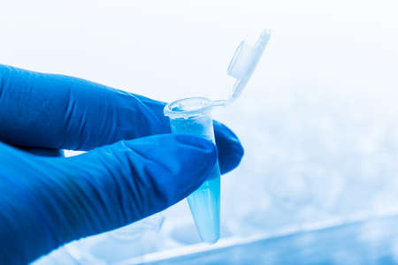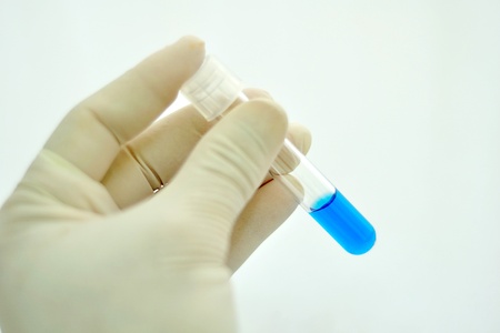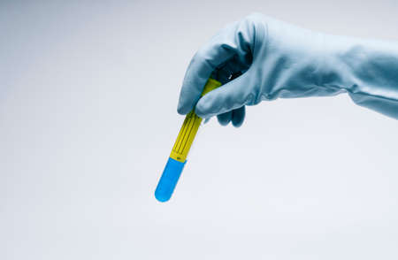 A scientist's hand in a glove holding a glass test tube with a blue liquid inside, color tones. close-up