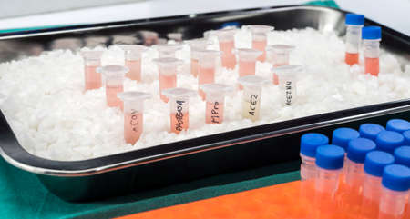 Vials with samples of SARS-COV-2 Covid-19 prepared cold in a hospital, conceptual image