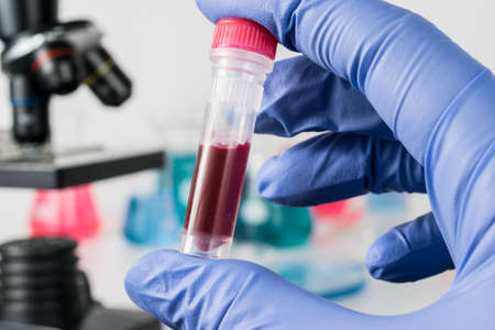 Blood tube. Covid 19 Test. doctor hand holding a blood sample tube for analysis in the lab background. Technician in medical gloves holding blood tube test for research vaccine protect virus infected.