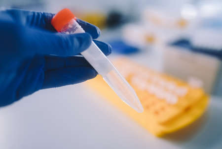 Doctor hands with orange cap transport vial, process for virus analysis, blue background.