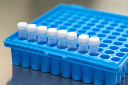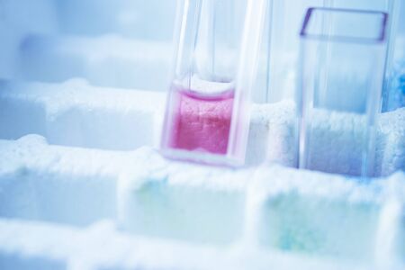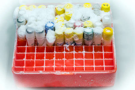 Frozen laboratory test tubes in box container without freezer in research lab.