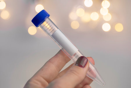 Scientist holding tube with suspension of stem cells for cryopreservation in Liquid Nitrogen bank.