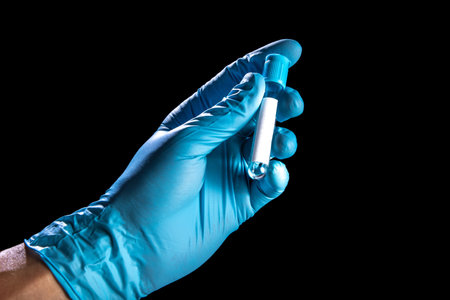 A hand in a medical blue rubber glove holds a blood test tube on a black background.
