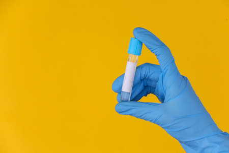 top view of hand in blue medical gloves holding blood test tube with copy space