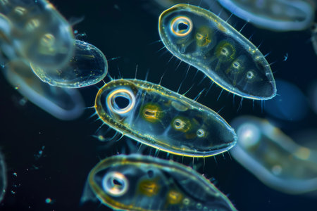 Infusoria aquatic. Tiny ciliates and flagellates create a vibrant ecosystem, embodying the intricate biodiversity within water environments, revealing the hidden world of minute, dynamic life forms