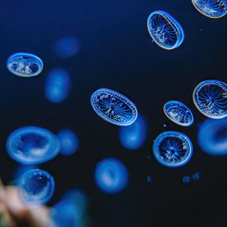 Numerous jellyfish with luminous circular bodies drift in dark blue water. The scene displays a focus on the jellyfish forms with an overhead perspective. The image uses a cool color palette with high contrast, suggesting a deep-water environment. Suitable for conceptual design, science publications, or educational resources.