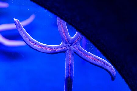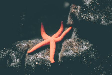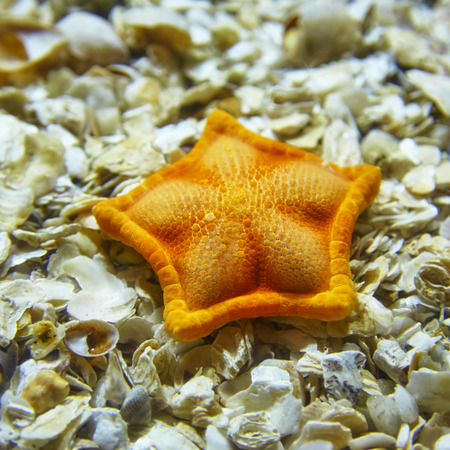 An orange starfish lying on shells in the Istanbul aquarium, Turkey