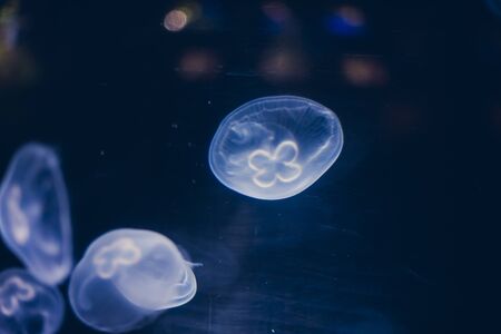Moon jellyfish swimming in deep blue ocean. Aurella sp. common saucer jelly neon colored in aquarium. Beautiful sea wild life on dark background