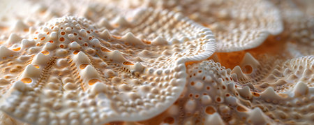 Hyperrealistic macro photograph of sand dollars showcasing intricate texture and detail, highlighting the natural beauty and complexity of marine life.