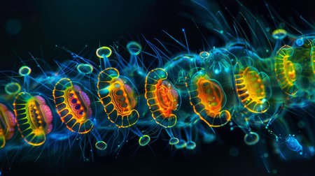 Close-up of plankton glowing in vivid colors under a high-powered microscope, revealing their unique structures