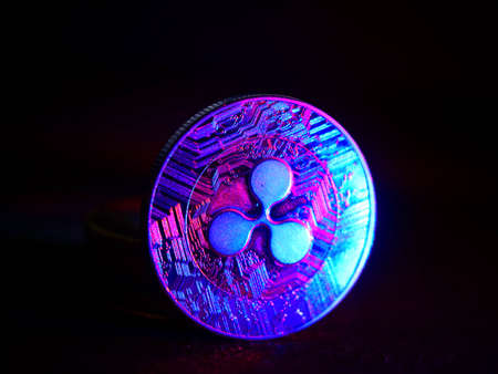 Crypto currency background with various of shiny silver and golden physical cryptocurrencies symbol coins, Bitcoin, Ethereum, Litecoin, zcash, ripple.