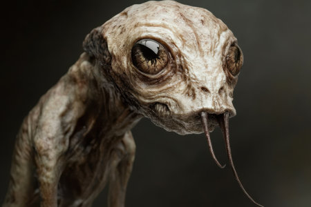 Close-up of a unique alien being showing detailed skin texture and striking yellow eyes.