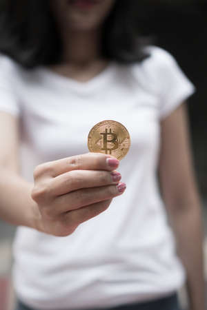 Bit coin coin in a woman's hands