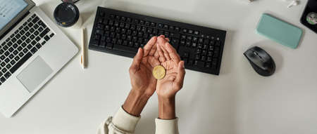 Top view of Trader Hands holding bitecoin coin