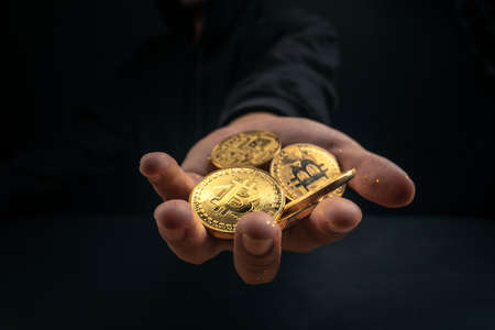 golden bitcoin coin on hand on dark background,crypto money