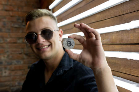 Young guy holds bitcoin in his hand. Loft design background