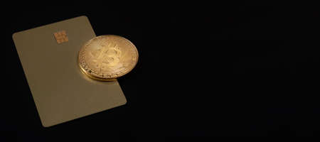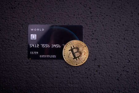 Golden coin with bitcoin logo and credit card. Leader in cryptocurrency BTC and bitcoin rewards card against black surface. Decentralized digital currency. Crypto payment. Electronic money or e-cash
