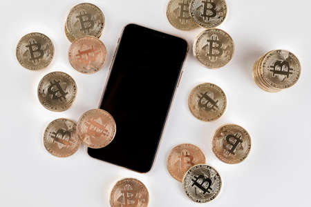 golden bitcoin coins on a smartphone, representing the electronic currency