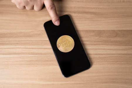 finger touching the smartphone and bitcoin on wooden table concept cryptocurrency exchange. technology and investment digital. finance, Trader, investor, gold Bitcoin Cash