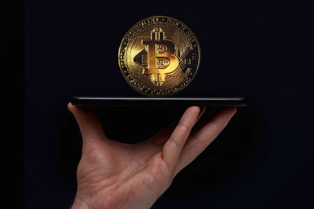 bitcoin, woman with mobile phone and golden coin and bitcoin in hands.