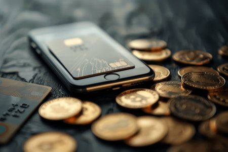 A cell phone with a credit card on top of it and a pile of gold coins next to it