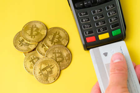 Bitcoin coins vs credit card payment using POS payment terminal on the yellow background.