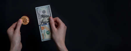 Hands holding bitcoin and banknote of us dollar on black background with copy space for text.