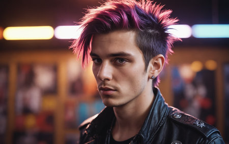 Portrait of a punk man in a leather jacket with a punk haircut.