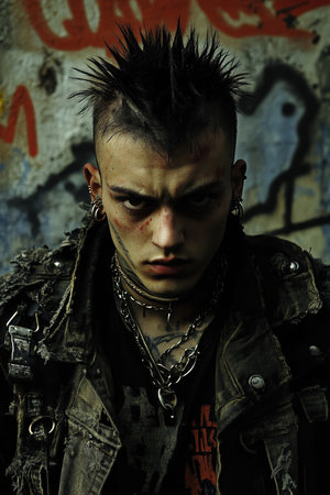 A person in punk attire with spiky hair, multiple piercings, and layered chains stands against a graffitied wall. The expression is intense and fierce, suggesting rebellion