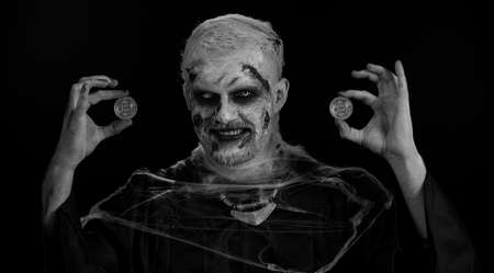 Zombie man with make-up with fake wounds scars showing golden bitcoins. Achievement career wealth, cryptocurrency investment, mining btc, future technology. Sinister dead guy. Halloween, filming