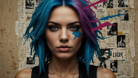 Portrait of beautiful young woman with blue hair and bright makeup.