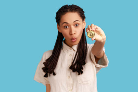 Portrait of excited astonished woman with black dreadlocks holding out bitcoin, coin of crypto currency, ecommerce, wearing white shirt. Indoor studio shot isolated on blue background.