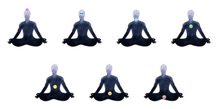 Yoga lotus pose. Padmasana with colored chakra points.