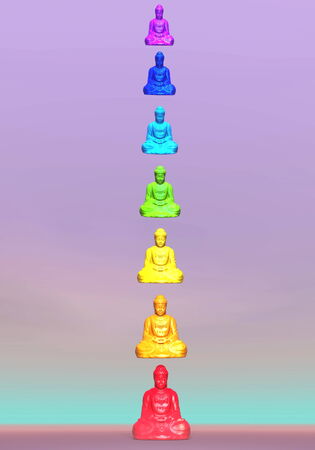 Seven colorful buddhas for chakra column in violet background