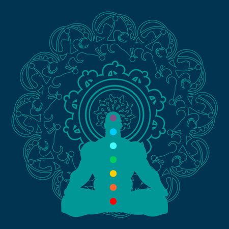 Abstract meditation man with seven chakras and mandala in the galaxy illustration design background.