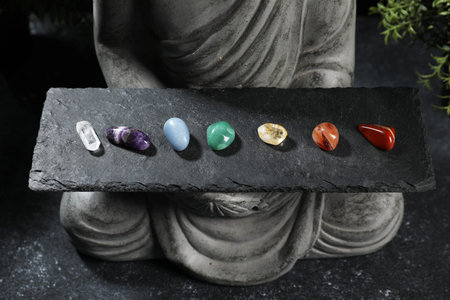 Statue with chakra gemstones on black table, closeup
