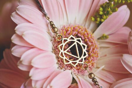 Tiny metal pendant piece in the shape of chakra bracelet on the pink flower