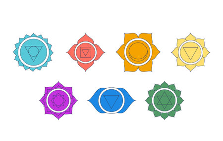 Seven chakra symbols 2D cartoon objects set. Spiritual sacred geometry. Holistic alternative healing energy centers isolated elements flat vector clip arts on white. Spot illustrations collection