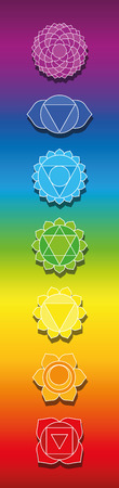 Seven chakras on rainbow colored background. Bookmark format illustration of spiritual, healing symbols.