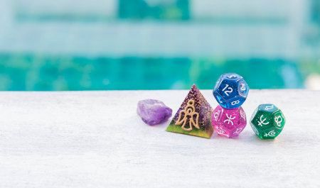 Pyramid with Astrology dice over blurred background, energy healing and protection with fortune telling tool