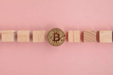 Bitcoin cryptocurrency coin blockchain technology concept. Coin with wood block