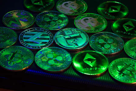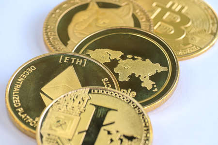 Crypto currency background with various of shiny silver and golden physical cryptocurrencies symbol coins, Bitcoin, Ethereum, Litecoin, zcash, ripple.