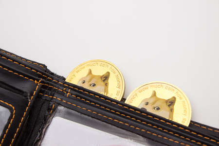 Dogecoins in a wallet on a table