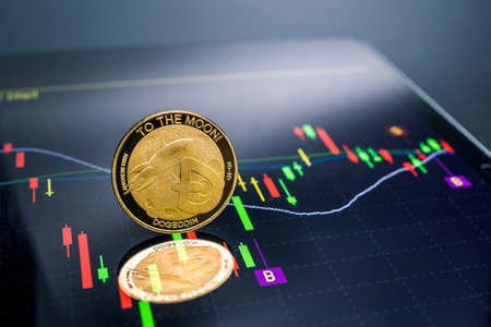 Maesot, Thailand- June 5, 2021:Dogecoin standing in front with background of the currency chart, New concept cryptocurrency virtual money is the future of digital currency online financial payments.