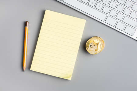 Blank sticky paper notepad and dogecoin on a gray table. Top view.