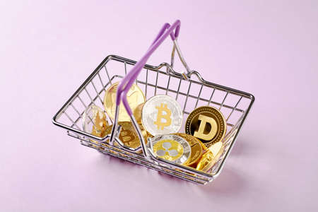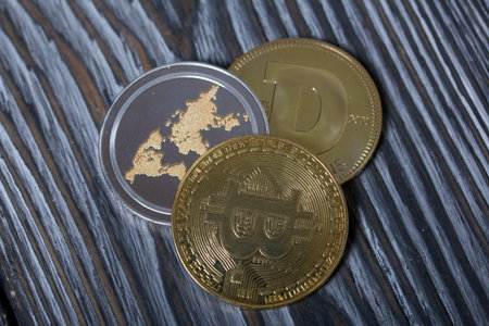 Symbolic cryptocurrency types represented as shiny coins are lined up against dark background. Among them dogecoin which started as a joke is currently gaining popularity