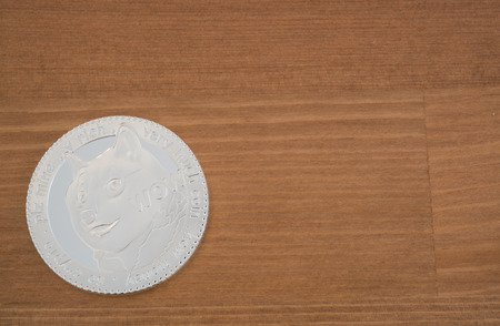 Real coin of silver dogecoin on wooden background