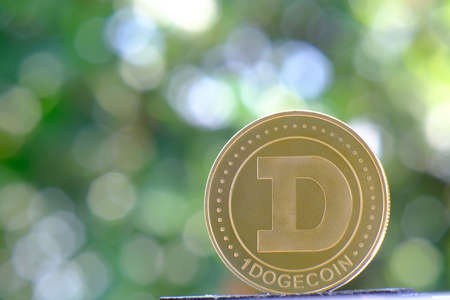 golden dogecoin coin on green bokeh background.