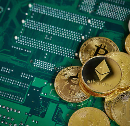 Stack of cryptocurrencies placed on the motherboard. Ethereum as most important cryptocurrency concept, close-up, selective focus. Cryptocurrency mining. Virtual business. Electornic commerce. Banking monetary. Cryptocurrency diversification.